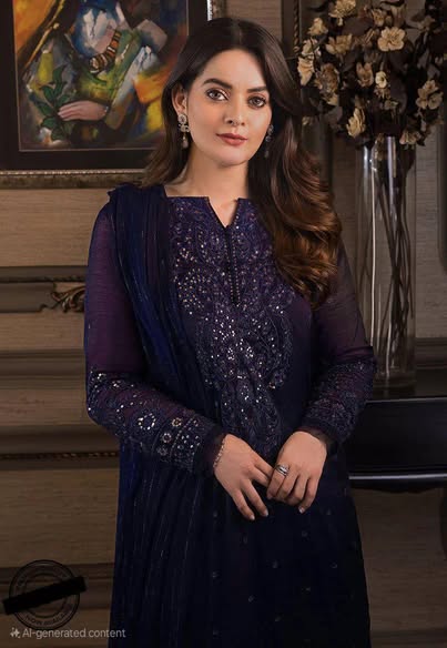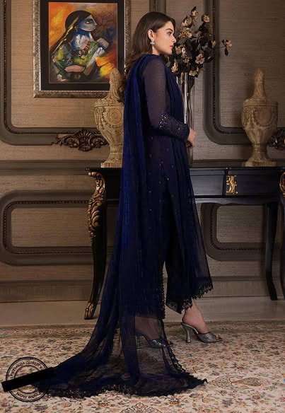 Premium chiffon with fully heavy embroidered sequin (spengle) work front, featuring an intricately embellished neckline and a richly embroidered daman border finished with elegant schifflie lace.